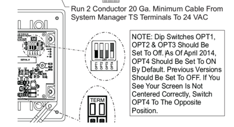 Check the jumpers located on the back of the Touchscreen System Manager, right next to the ‘R’ ‘S’ ‘T’ green terminal block.
